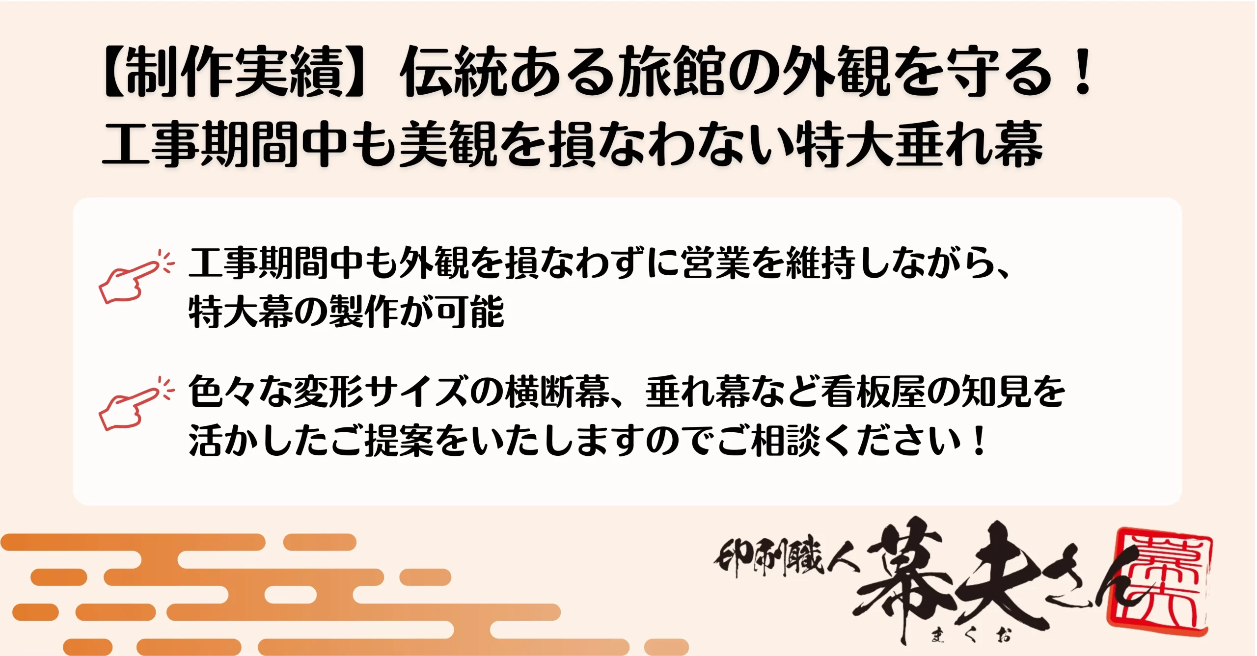 今回は、旅館正面の外観を再現したデザインを幕に印刷することで、 工事期間中であっても違和感のない景観を保つ仕様をご提案しました。 また、サイズや分割位置(3分割)を含め、現場の足場形状に合わせた設計を行うことで、設置時の手戻りを減らし、仕上がりの精度も高めています。