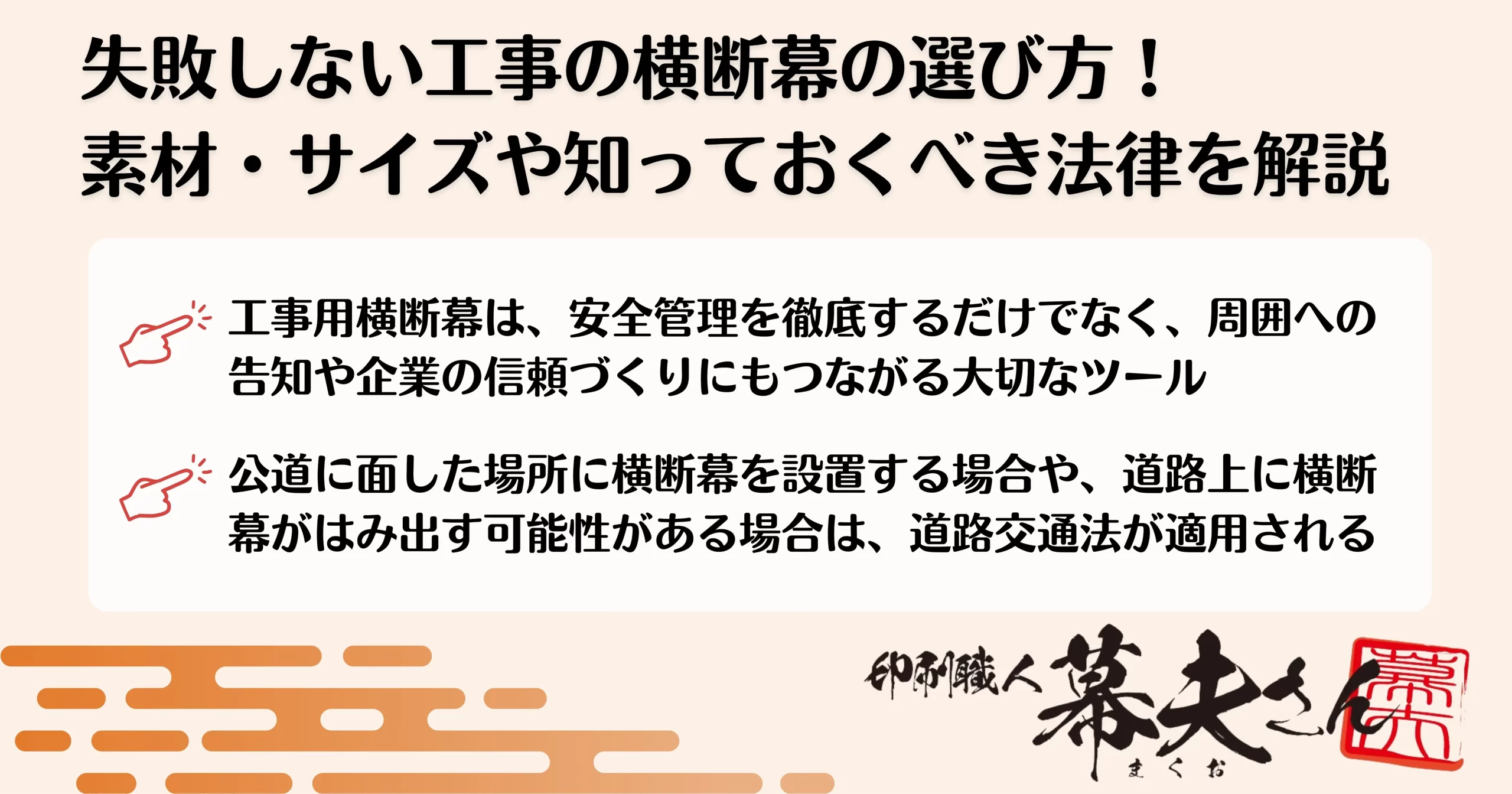 これらの法律は、安全でスムーズな工事の基本です。ルールを守るだけでなく、横断幕を活用して現場の安全を確保し、地域への配慮も示しましょう。